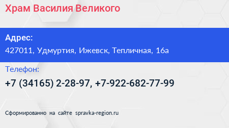 Храм Василия Великого по адресу 427011, Удмуртия, Ижевск, Тепличная, 16а в дальнейшем Организация, размещена в следующих категориях: