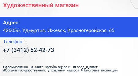 Художественный магазин по адресу 426056, Удмуртия, Ижевск, Красногеройская, 65 в дальнейшем Организация, размещена в следующих категориях: