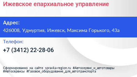 Ижевское епархиальное управление по адресу 426008, Удмуртия, Ижевск, Максима Горького, 43а в дальнейшем Организация, размещена в следующих категориях: