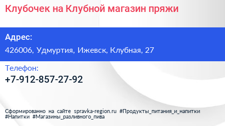 Клубочек на Клубной, магазин пряжи по адресу 426006, Удмуртия, Ижевск, Клубная, 27 в дальнейшем Организация, размещена в следующих категориях: