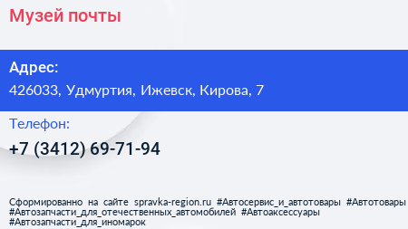 Музей почты по адресу 426033, Удмуртия, Ижевск, Кирова, 7 в дальнейшем Организация, размещена в следующих категориях: