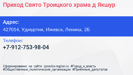 Приход Свято-Троицкого храма, д. Якшур по адресу 427014, Удмуртия, Ижевск, Ленина, 2Б в дальнейшем Организация, размещена в следующих категориях: