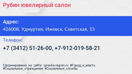 Рубин, ювелирный салон по адресу 426008, Удмуртия, Ижевск, Советская, 15 в дальнейшем Организация, размещена в следующих категориях: