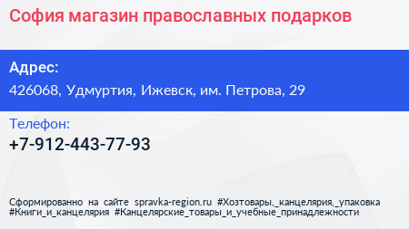 София, магазин православных подарков по адресу 426068, Удмуртия, Ижевск, им. Петрова, 29 в дальнейшем Организация, размещена в следующих категориях: