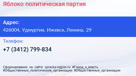 Яблоко, политическая партия по адресу 426004, Удмуртия, Ижевск, Ленина, 29 в дальнейшем Организация, размещена в следующих категориях:
