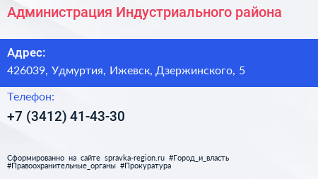 Администрация Индустриального района по адресу 426039, Удмуртия, Ижевск, Дзержинского, 5 в дальнейшем Организация, размещена в следующих категориях: