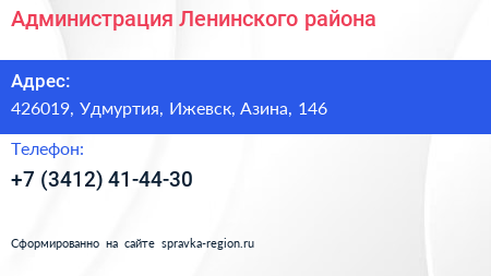 Администрация Ленинского района по адресу 426019, Удмуртия, Ижевск, Азина, 146 в дальнейшем Организация, размещена в следующих категориях:
