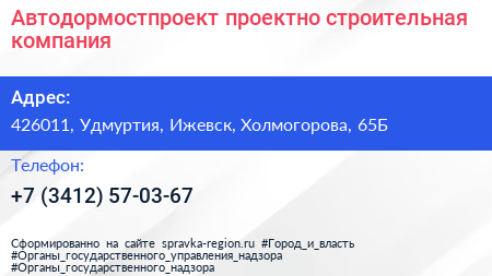 Автодормостпроект, проектно-строительная компания по адресу 426011, Удмуртия, Ижевск, Холмогорова, 65Б в дальнейшем Организация, размещена в следующих категориях: