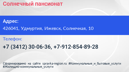 Солнечный, пансионат по адресу 426041, Удмуртия, Ижевск, Солнечная, 10 в дальнейшем Организация, размещена в следующих категориях: