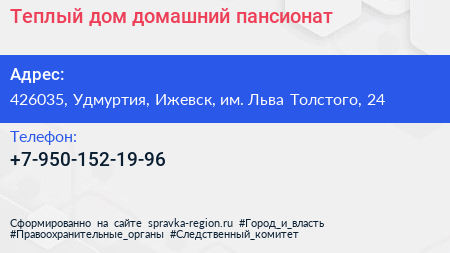 Теплый дом, домашний пансионат по адресу 426035, Удмуртия, Ижевск, им. Льва Толстого, 24 в дальнейшем Организация, размещена в следующих категориях: