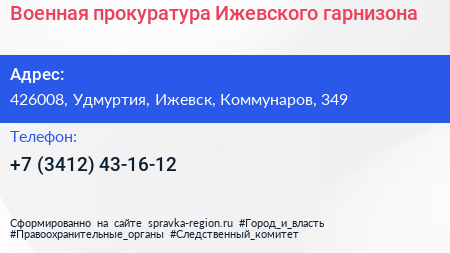 Военная прокуратура Ижевского гарнизона по адресу 426008, Удмуртия, Ижевск, Коммунаров, 349 в дальнейшем Организация, размещена в следующих категориях:
