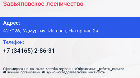 Завьяловское лесничество по адресу 427026, Удмуртия, Ижевск, Нагорная, 2а в дальнейшем Организация, размещена в следующих категориях: