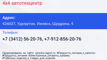 4x4, автотехцентр по адресу 426027, Удмуртия, Ижевск, Щедрина, 4 в дальнейшем Организация, размещена в следующих категориях: