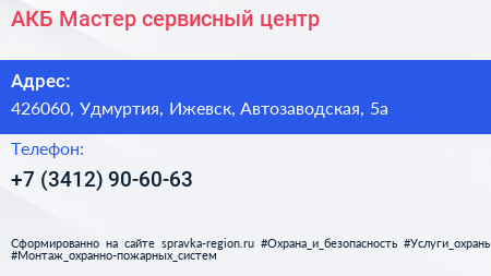 АКБ Мастер, сервисный центр по адресу 426060, Удмуртия, Ижевск, Автозаводская, 5а в дальнейшем Организация, размещена в следующих категориях: