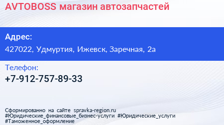 AVTOBOSS, магазин автозапчастей по адресу 427022, Удмуртия, Ижевск, Заречная, 2а в дальнейшем Организация, размещена в следующих категориях: