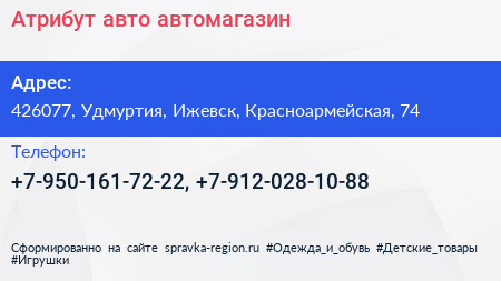Атрибут авто, автомагазин по адресу 426077, Удмуртия, Ижевск, Красноармейская, 74 в дальнейшем Организация, размещена в следующих категориях: