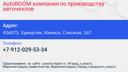 AutoROOM, компания по производству авточехлов по адресу 426073, Удмуртия, Ижевск, Союзная, 167 в дальнейшем Организация, размещена в следующих категориях: