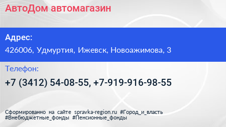 АвтоДом, автомагазин по адресу 426006, Удмуртия, Ижевск, Новоажимова, 3 в дальнейшем Организация, размещена в следующих категориях: