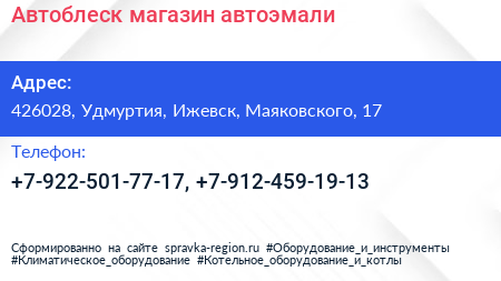 Автоблеск, магазин автоэмали по адресу 426028, Удмуртия, Ижевск, Маяковского, 17 в дальнейшем Организация, размещена в следующих категориях: