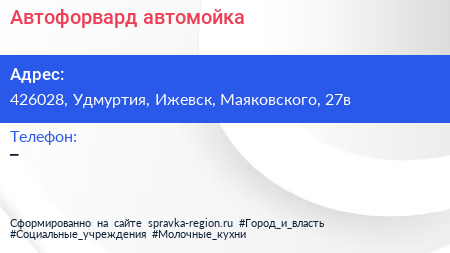 Автофорвард, автомойка по адресу 426028, Удмуртия, Ижевск, Маяковского, 27в в дальнейшем Организация, размещена в следующих категориях: