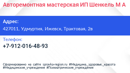 Авторемонтная мастерская, ИП Шенкель М.А. по адресу 427011, Удмуртия, Ижевск, Трактовая, 2в в дальнейшем Организация, размещена в следующих категориях: