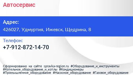 Автосервис по адресу 426027, Удмуртия, Ижевск, Щедрина, 8 в дальнейшем Организация, размещена в следующих категориях: