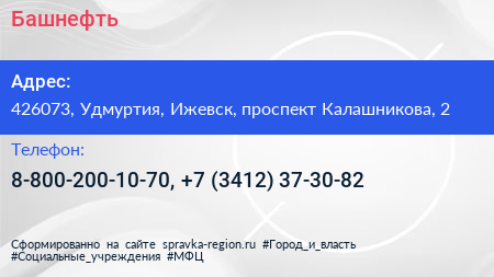 Башнефть по адресу 426073, Удмуртия, Ижевск, проспект Калашникова, 2 в дальнейшем Организация, размещена в следующих категориях:
