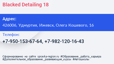 Blacked Detailing 18+ по адресу 426006, Удмуртия, Ижевск, Олега Кошевого, 16 в дальнейшем Организация, размещена в следующих категориях: