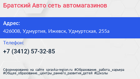 Братский Авто, сеть автомагазинов по адресу 426008, Удмуртия, Ижевск, Удмуртская, 255а в дальнейшем Организация, размещена в следующих категориях: