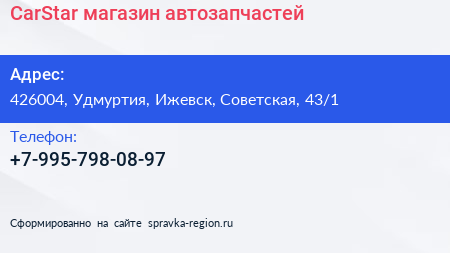 CarStar, магазин автозапчастей по адресу 426004, Удмуртия, Ижевск, Советская, 43/1 в дальнейшем Организация, размещена в следующих категориях: