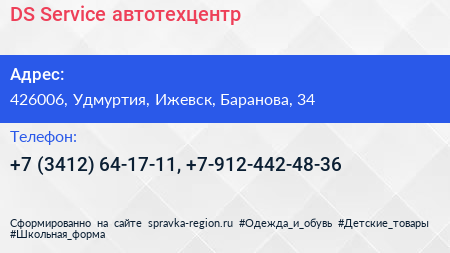 DS Service, автотехцентр по адресу 426006, Удмуртия, Ижевск, Баранова, 34 в дальнейшем Организация, размещена в следующих категориях: