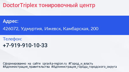 DoctorTriplex, тонировочный центр по адресу 426072, Удмуртия, Ижевск, Камбарская, 200 в дальнейшем Организация, размещена в следующих категориях: