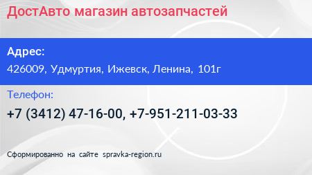 ДостАвто, магазин автозапчастей по адресу 426009, Удмуртия, Ижевск, Ленина, 101г в дальнейшем Организация, размещена в следующих категориях: