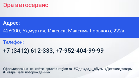 Эра, автосервис по адресу 426000, Удмуртия, Ижевск, Максима Горького, 222а в дальнейшем Организация, размещена в следующих категориях: