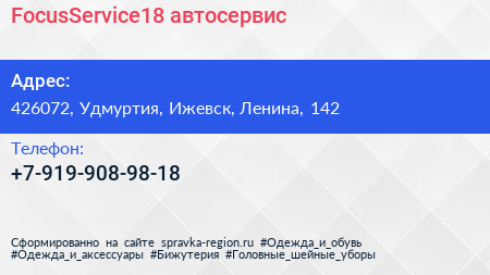 FocusService18, автосервис по адресу 426072, Удмуртия, Ижевск, Ленина, 142 в дальнейшем Организация, размещена в следующих категориях: