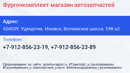 Фургонкомплект, магазин автозапчастей по адресу 426039, Удмуртия, Ижевск, Воткинское шоссе, 198 к2 в дальнейшем Организация, размещена в следующих категориях: