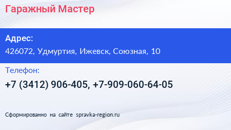 Гаражный Мастер по адресу 426072, Удмуртия, Ижевск, Союзная, 10 в дальнейшем Организация, размещена в следующих категориях: