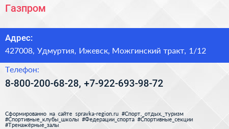 Газпром по адресу 427008, Удмуртия, Ижевск, Можгинский тракт, 1/12 в дальнейшем Организация, размещена в следующих категориях: