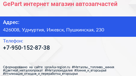 GePart, интернет-магазин автозапчастей по адресу 426008, Удмуртия, Ижевск, Пушкинская, 230 в дальнейшем Организация, размещена в следующих категориях: