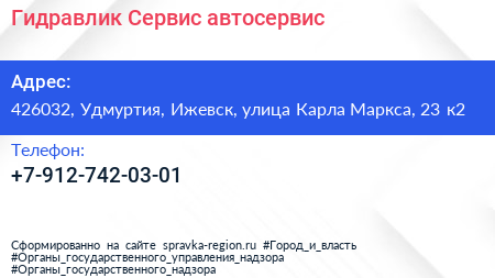 Гидравлик-Сервис, автосервис по адресу 426032, Удмуртия, Ижевск, улица Карла Маркса, 23 к2 в дальнейшем Организация, размещена в следующих категориях: