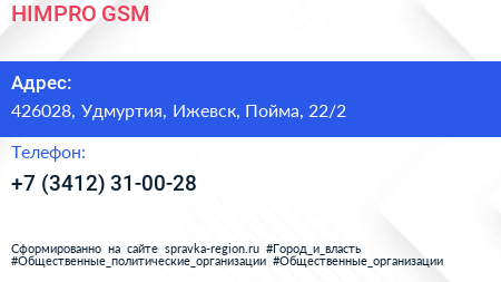 HIMPRO GSM по адресу 426028, Удмуртия, Ижевск, Пойма, 22/2 в дальнейшем Организация, размещена в следующих категориях: