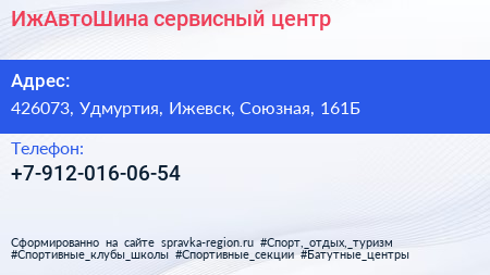 ИжАвтоШина, сервисный центр по адресу 426073, Удмуртия, Ижевск, Союзная, 161Б в дальнейшем Организация, размещена в следующих категориях: