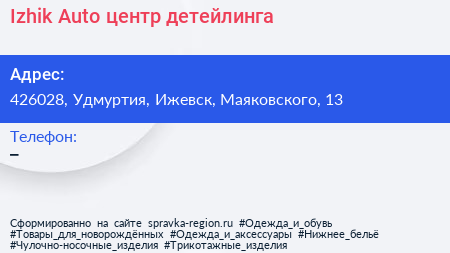 Izhik-Auto, центр детейлинга по адресу 426028, Удмуртия, Ижевск, Маяковского, 13 в дальнейшем Организация, размещена в следующих категориях: