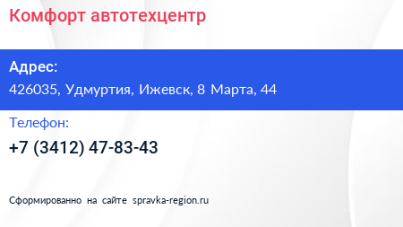 Комфорт, автотехцентр по адресу 426035, Удмуртия, Ижевск, 8 Марта, 44 в дальнейшем Организация, размещена в следующих категориях: