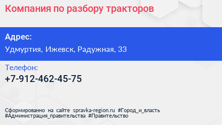 Компания по разбору тракторов по адресу Удмуртия, Ижевск, Радужная, 33 в дальнейшем Организация, размещена в следующих категориях: