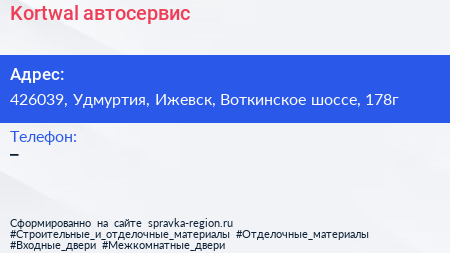 Kortwal, автосервис по адресу 426039, Удмуртия, Ижевск, Воткинское шоссе, 178г в дальнейшем Организация, размещена в следующих категориях: