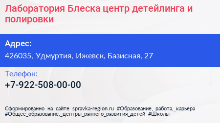 Лаборатория Блеска, центр детейлинга и полировки по адресу 426035, Удмуртия, Ижевск, Базисная, 27 в дальнейшем Организация, размещена в следующих категориях: