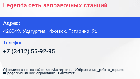 Legenda, сеть заправочных станций по адресу 426049, Удмуртия, Ижевск, Гагарина, 91 в дальнейшем Организация, размещена в следующих категориях: