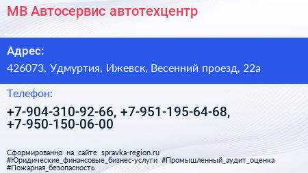 МВ Автосервис, автотехцентр по адресу 426073, Удмуртия, Ижевск, Весенний проезд, 22а в дальнейшем Организация, размещена в следующих категориях: