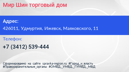 Мир Шин, торговый дом по адресу 426011, Удмуртия, Ижевск, Маяковского, 11 в дальнейшем Организация, размещена в следующих категориях: